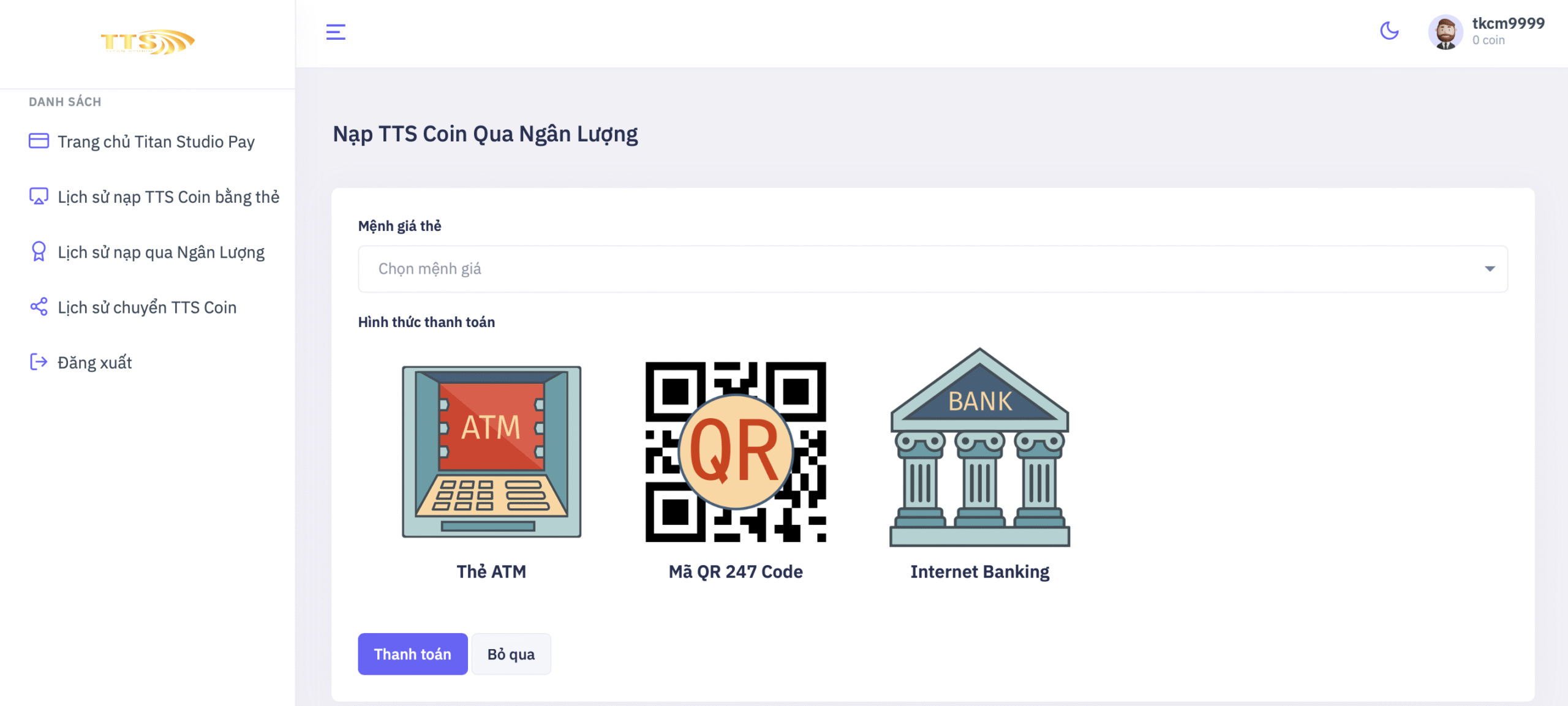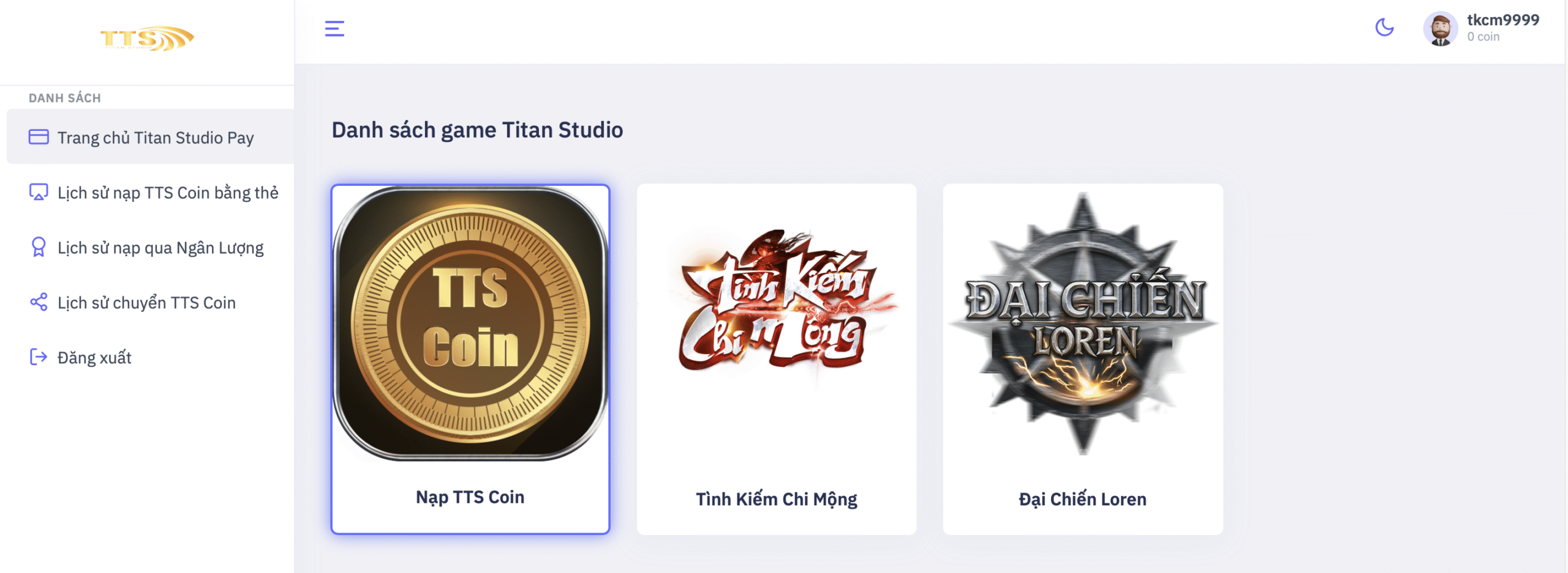 ◊ Khi hệ thống chuyển về trang nạp thẻ, hãy chọn game “Tình Kiếm Chi Mộng” để chuyển đổi TTS Coin.