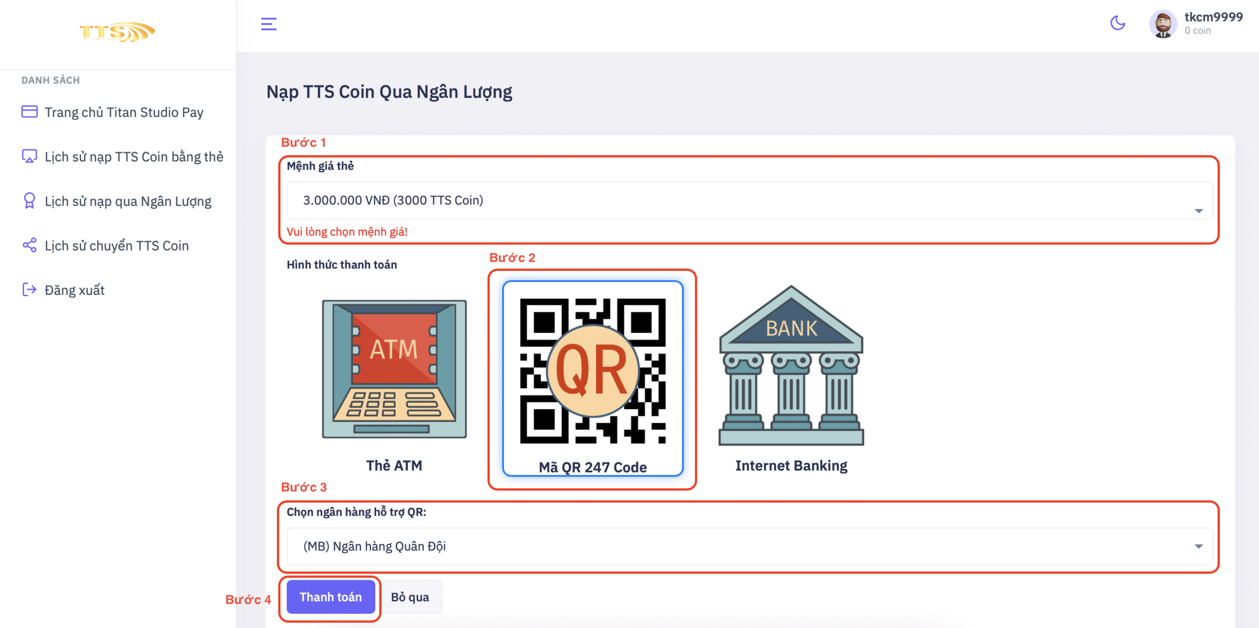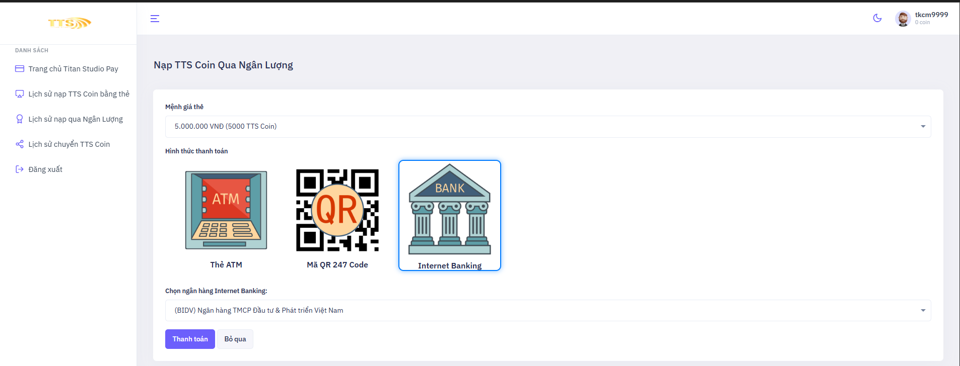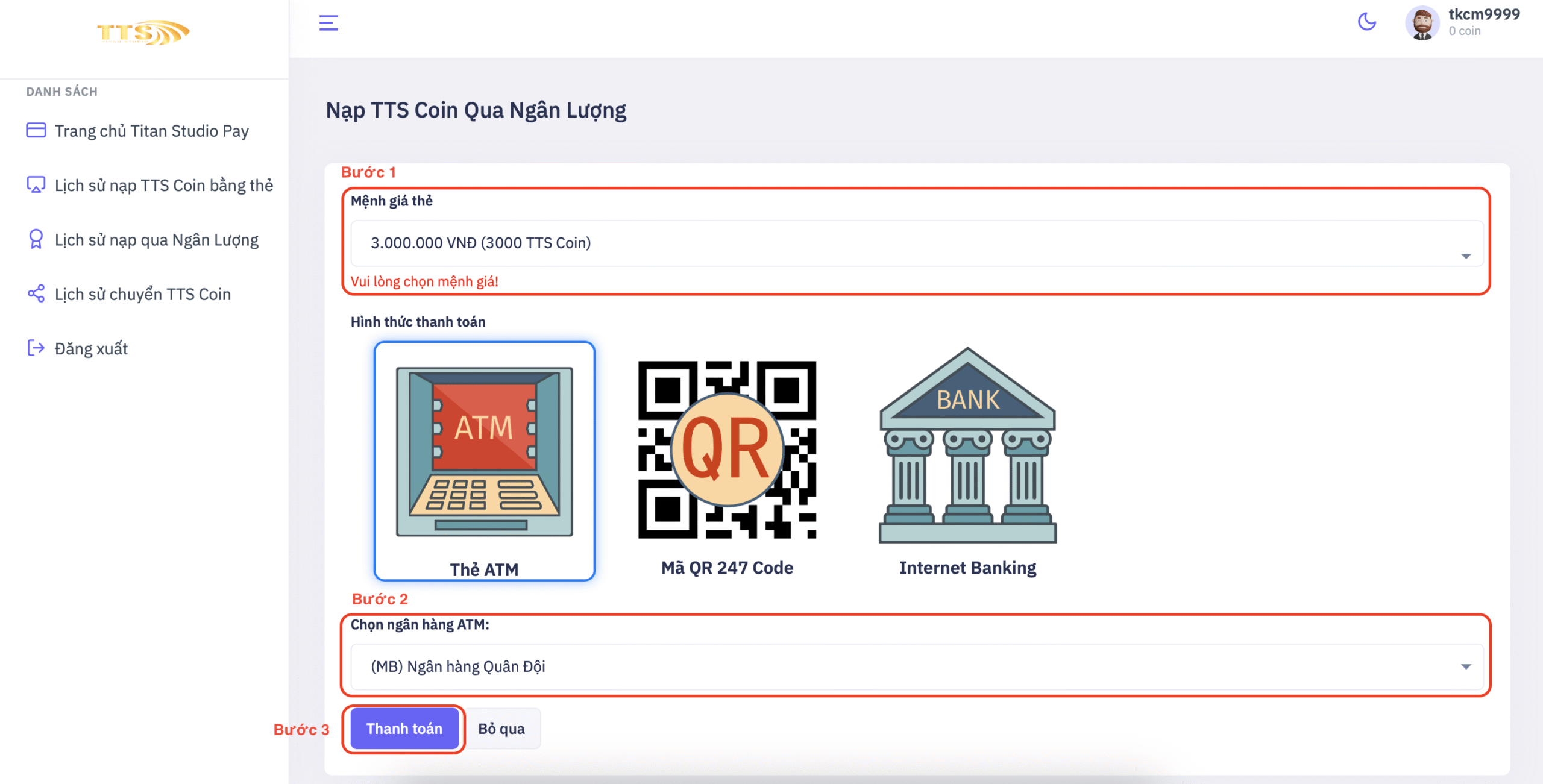 ◊ Sau đó : Lựa chọn phương thức thanh toán (ATM, Mã QR, Internet Banking).